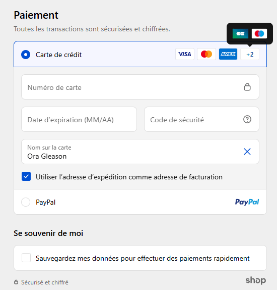 Nous acceptons les paiements par carte bancaire (Visa, Mastercard, American Express, Carte Bancaire), ainsi que via Apple Pay, PayPal et Shop Pay. Toutes les transactions sont sécurisées et entièrement chiffrées.